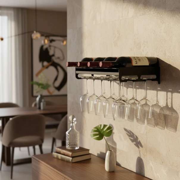 Além de ser uma linda peça, ela também é muito pratica e versátil, pois permite acomodar com segurança até 10 ou 12 taças e possibilita armazenar 6 garrafas de vinho.
