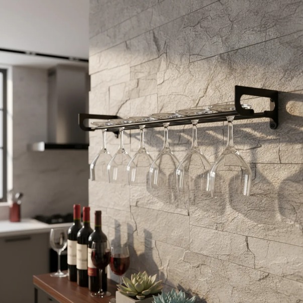 Esse porta taças foi desenvolvido para você que procura dispor suas taças de forma prática para utilizá-las no dia a dia. Esse produto foi desenvolvido especialmente para quem não possui espaço aéreo acessível para instalação de porta taças de teto. Assim, oferecemos uma solução com fixação na parede. Podendo ser utilizado na cozinha, bar, churrasqueira, sala, entre outros, permitindo que o ambiente fique organizado. Se preferir, você poderá instalar dentro de armários (nas portas, nas laterais e nos fundos), o que também é uma boa opção, para aqueles que não gostam de louças expostas.